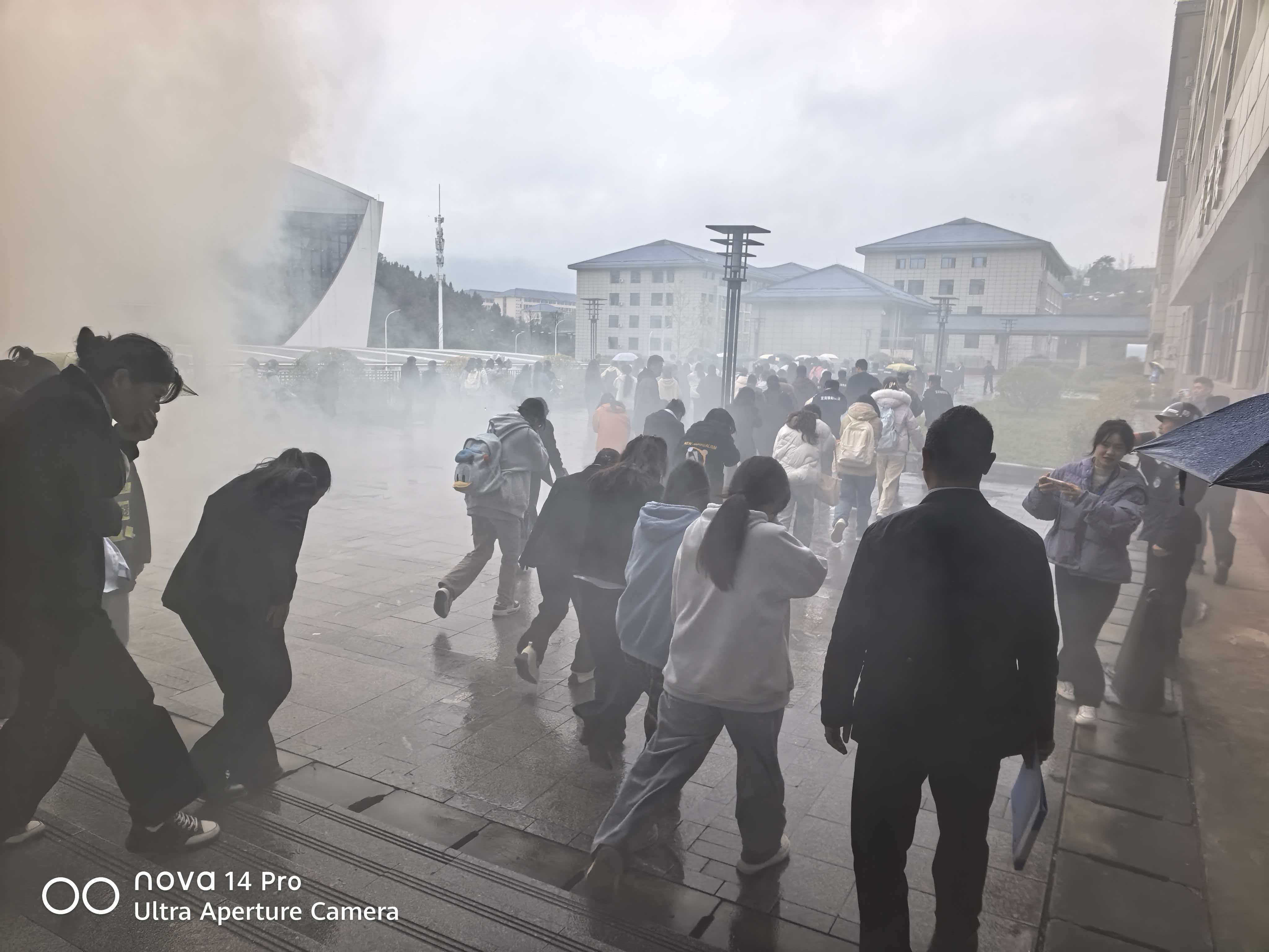 模拟火情应急疏散演练时,参训师生职工按照应急预案要求,沿指定路线快速有序撤离至安全区域。整个过程组织严密、响应及时,有效检验了各职能部门在突发情况下的协调配合及疏散引导能力。