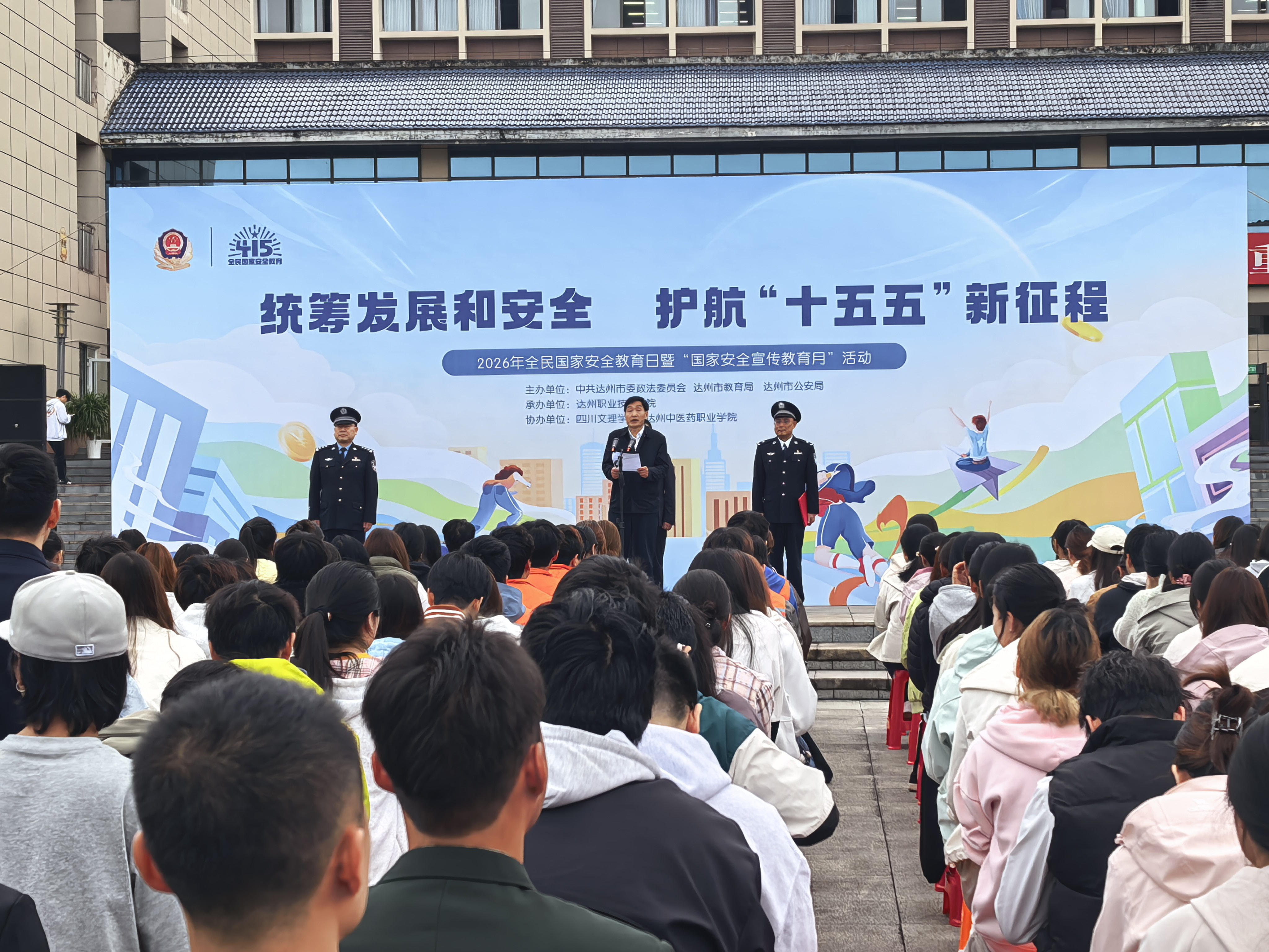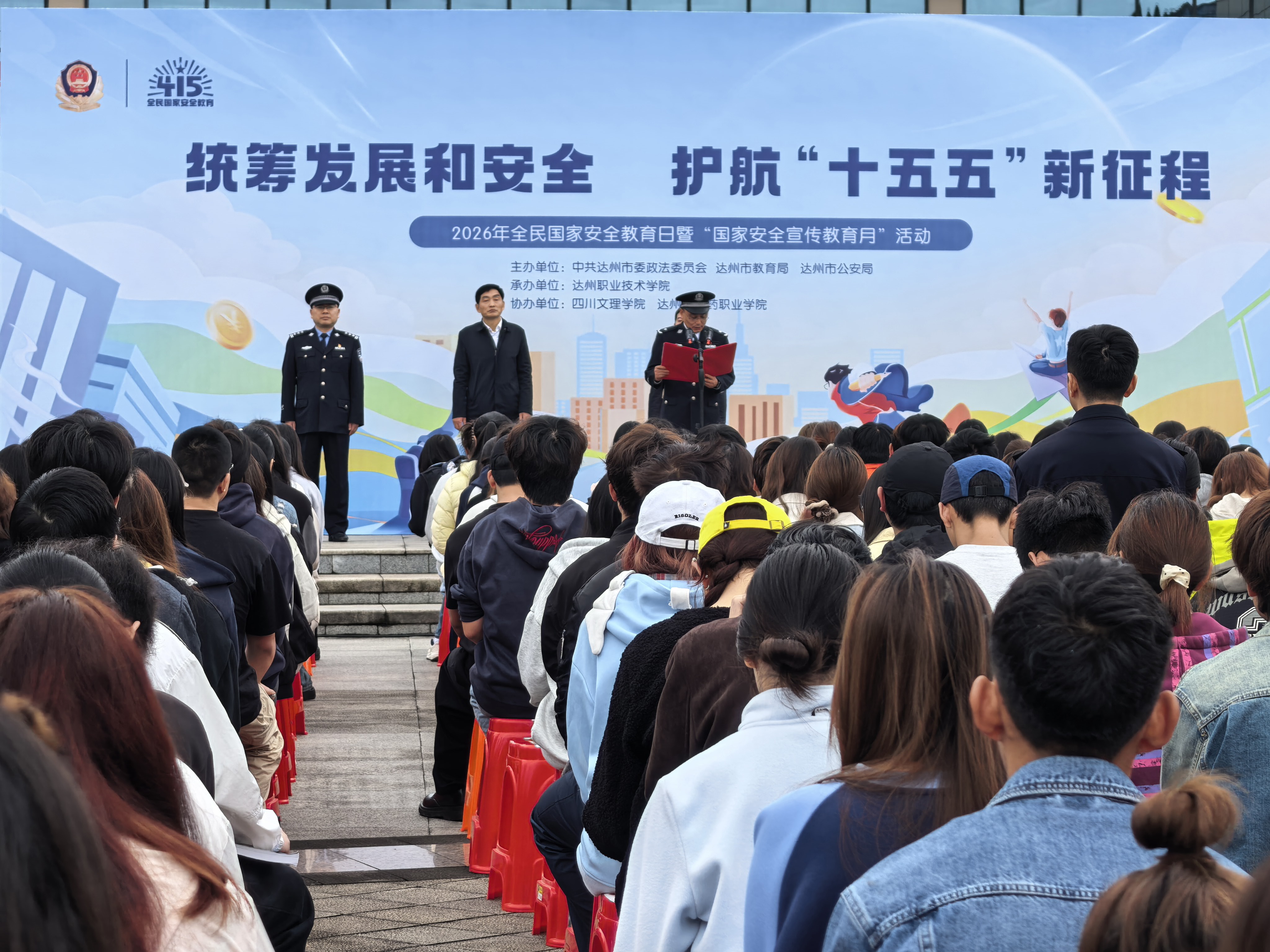 4月15日上午,第十一个全民国家安全教育日之际,由达州市教育局、市公安局联合主办,达州职业技术学院承办,四川文理学院、达州中医药职业学院协办的“2026年全民国家安全教育日暨国家安全宣传教育月活动”在达州职业技术学院望犀校区隆重举行。活动以“统筹发展和安全,护航‘十五五’新征程”为主题,汇聚三校师生代表与公安干警,共筑校园安全防线,厚植青年群体国家安全意识。